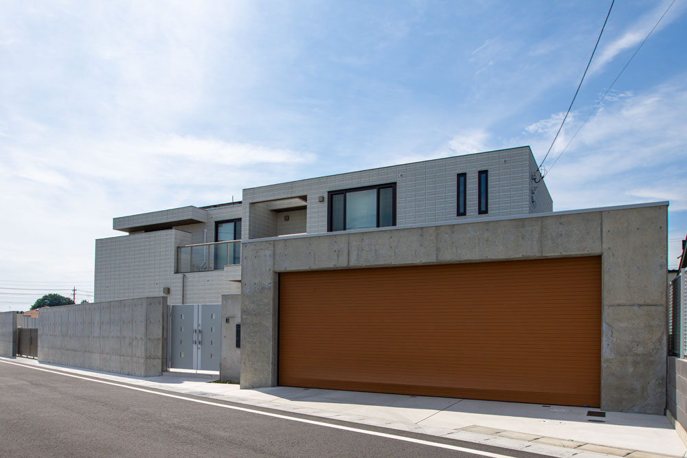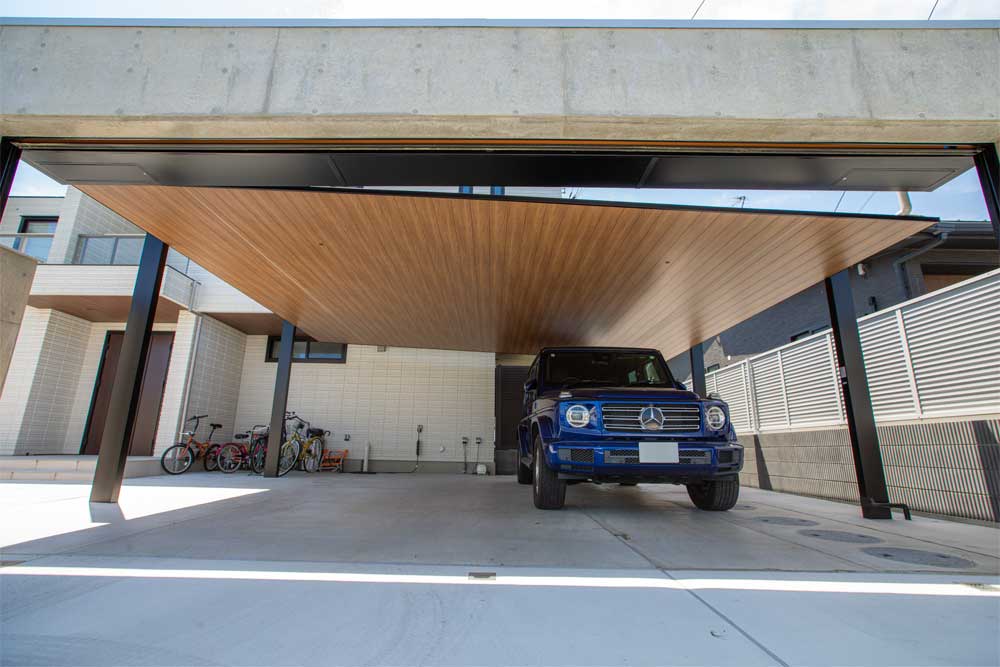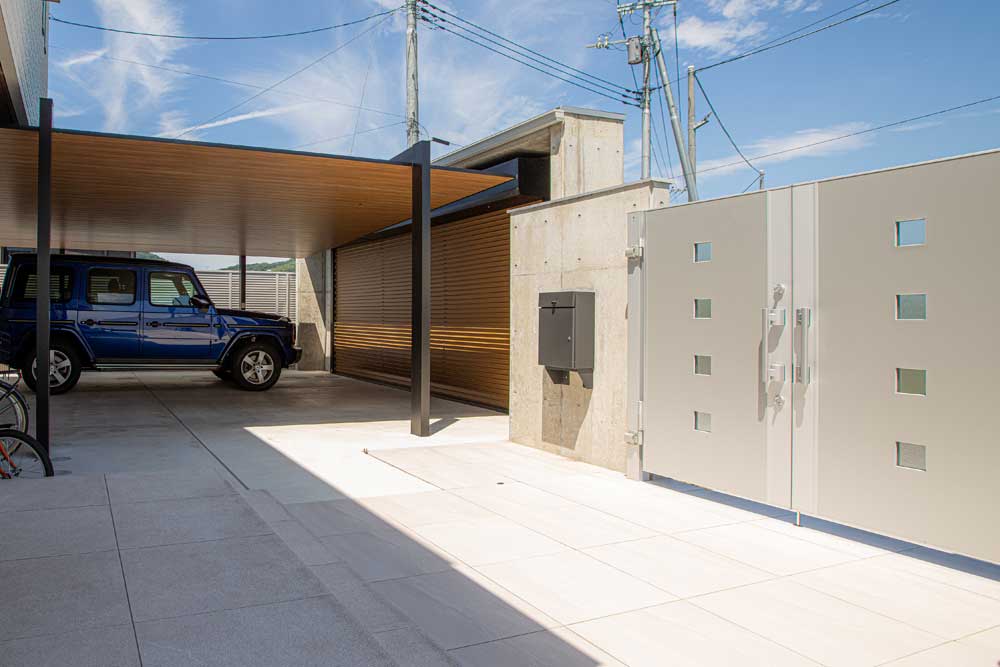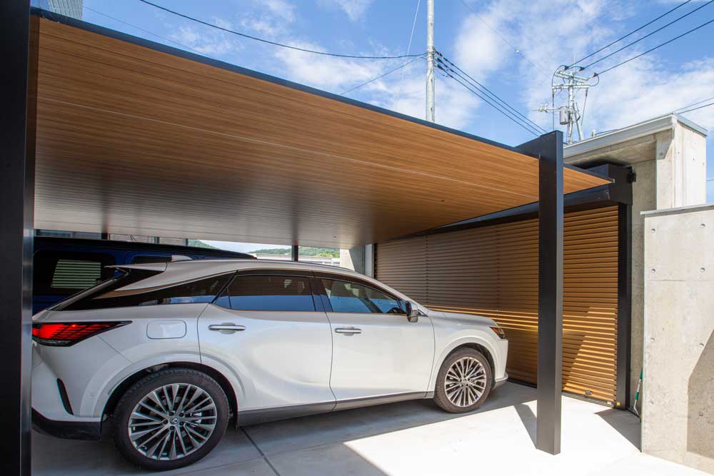 木調色のアクセントでスタイリッシュでありながら暖かみのある車庫まわりになりました。